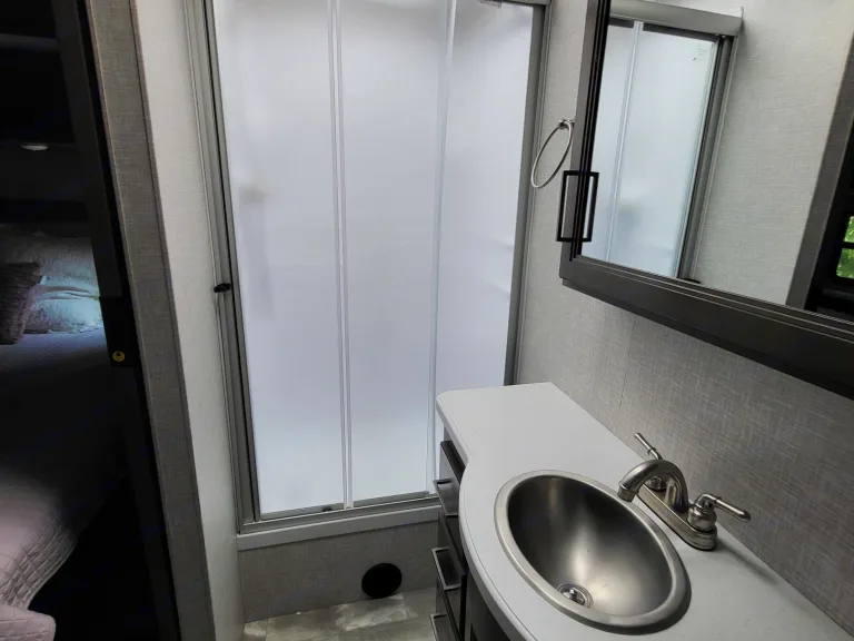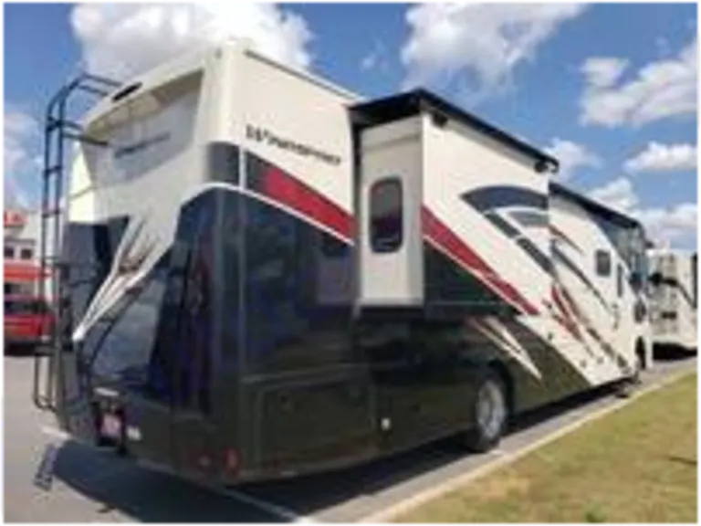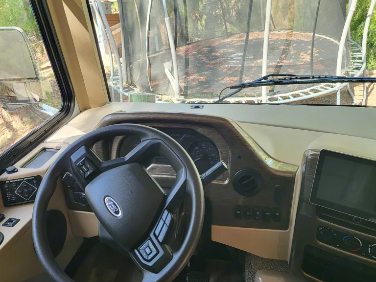 • Sleek Exterior Design: Built on a Ford chassis with a 7.3L V-8 engine, a tinted one-piece windshield, and automatic headlights for a smooth ride and stylish look.