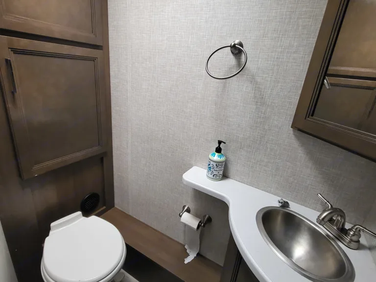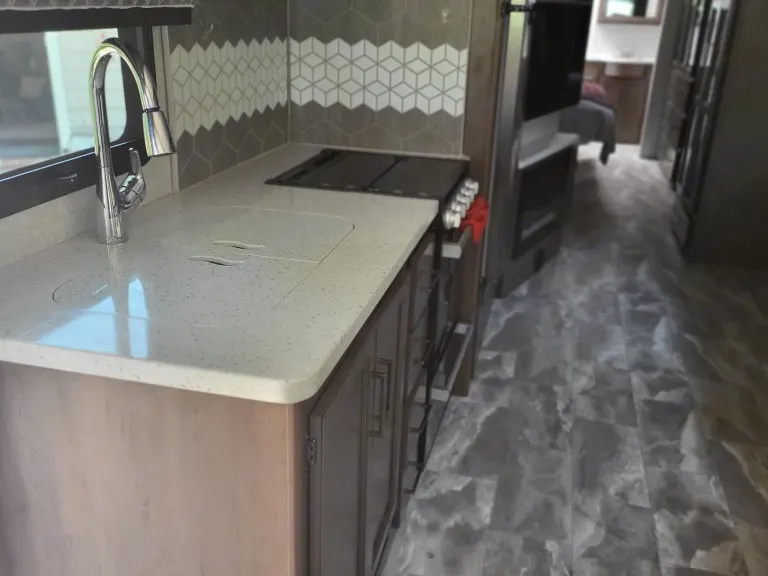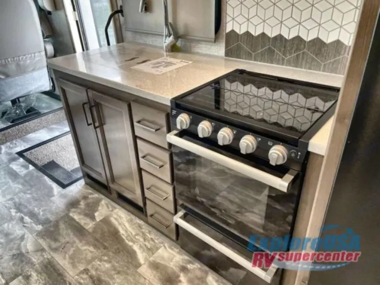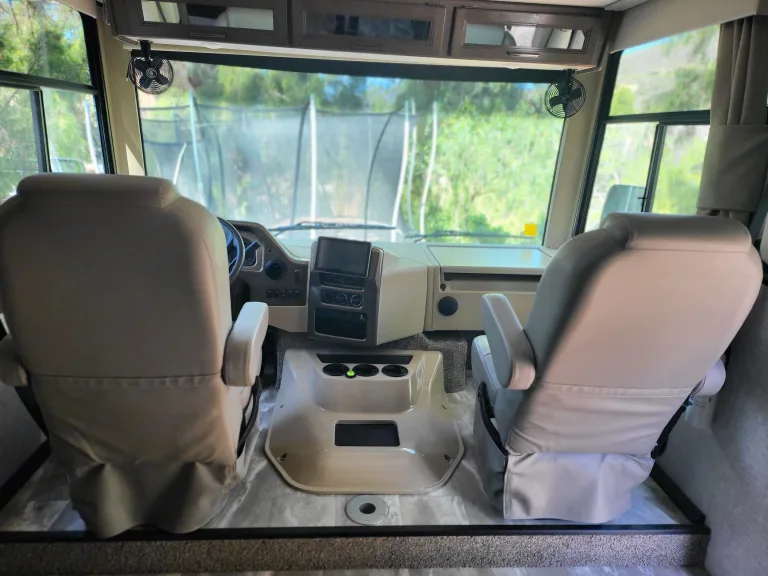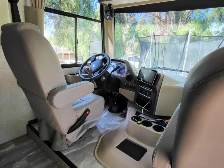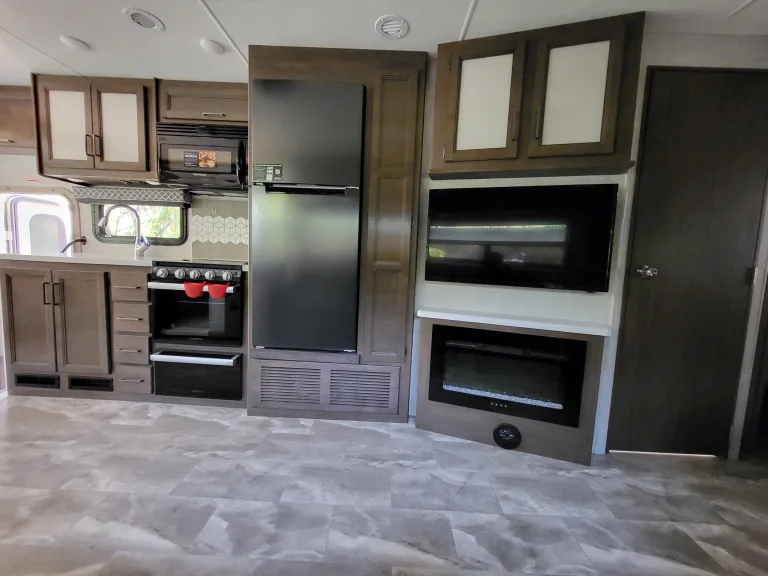 • Modern Interior Design: Stylish finishes, swiveling captain’s chairs, and a cozy electronic fireplace make this RV feel like home.