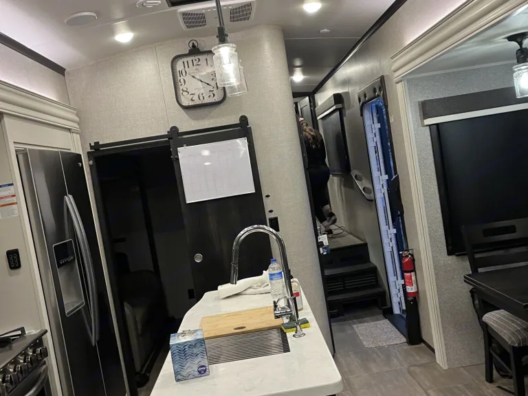 This fifth wheel worked perfect for 4 adults and 1 kid to sleep and roomy enough to make a meal for a group of 15. No issues with drop off or pick up. It could use a good deep cleaning and dusting, but the fridge, stove, and pantry were very clean. It was a great experience throughout.