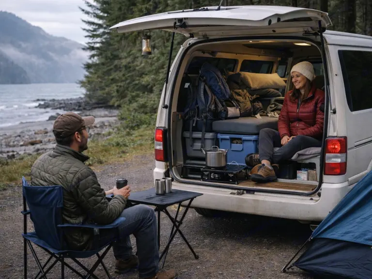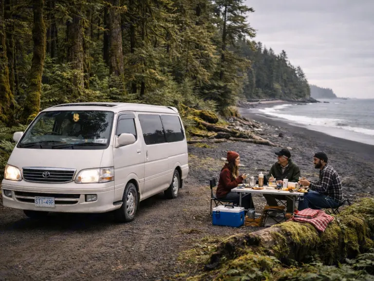Campervan FeaturesComfortable bed / sleeping platformMattress and bedding setupBuilt-in storage for gear and personal itemsSimple kitchen setup for camp-style cookingTable or flat surface for food prep and mealsInterior lightingPower setup suitable for charging small devicesPractical, easy-to-use layout designed for island travelWith its roomier interior, the HiAce offers a bit more space while maintaining the same straightforward, adventure-ready layoutAs with all our vehicles, this campervan is well-maintained, reliable, and ready for Haida Gwaii conditions, making it a great choice for exploring beaches, forests, and remote areas at your own pace.