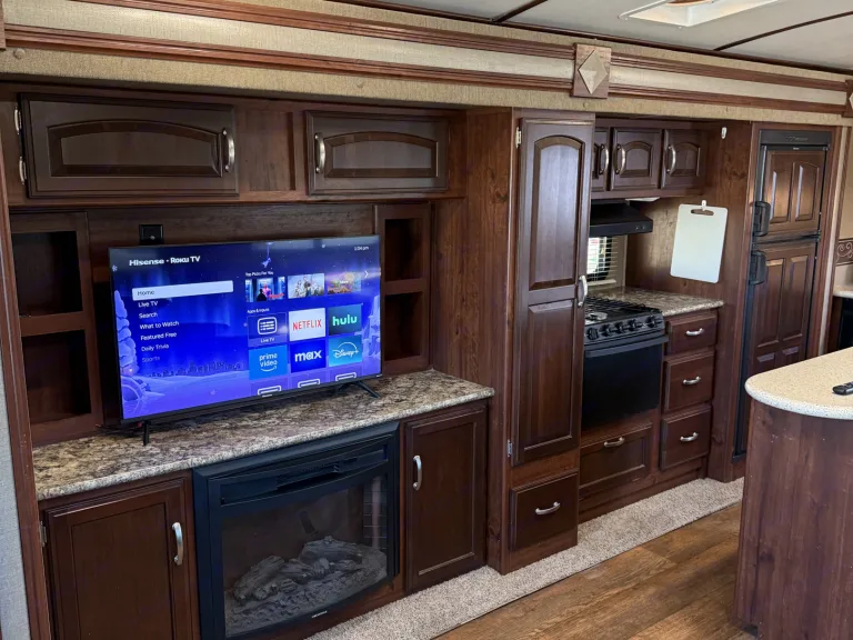 Spacious Living Area – Dual opposing slides open up the space, featuring cozy seating, sofa bed, and entertainment center with a TV & fireplace.