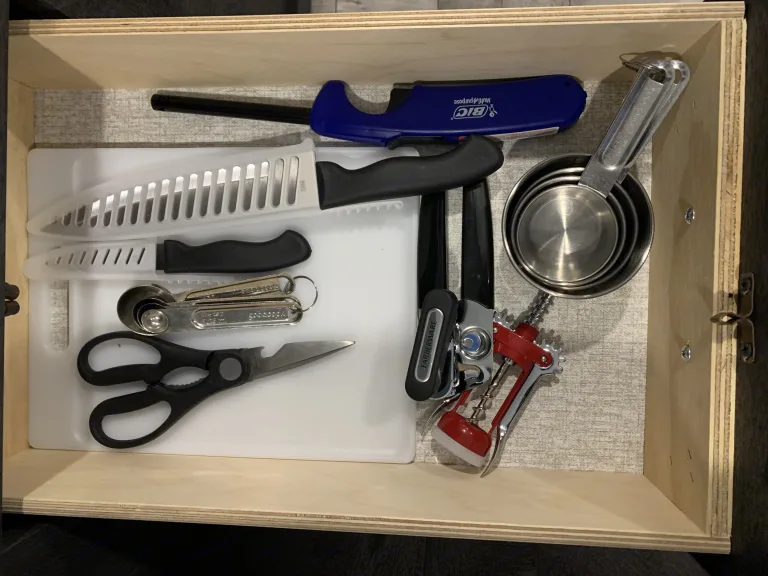 8x10 Outdoor Area Mat, 2ea folding camp chairs, outdoor kitchen with Griddle & Fridge, Retractable awning with Blue LED lights, Outdoor shower, battery powered drill with battery for setting up stabilizers (if applicable)