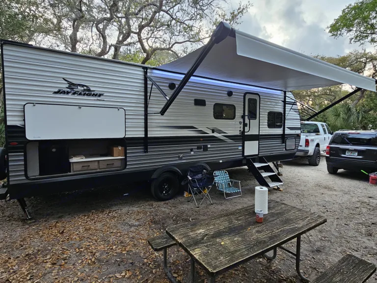 Better than a hotel. It's home on wheels!You will love the versatility our travel trailer provides. Pack up and go for a quick weekend get away with your family, or take off for weeks and invite family and friends to join along.Our Jay Flight sleeps 8. The private master room with queen bed, a fold out couch sleeper, the booth dinette table that converts to a bed and the double sized bunk beds allow plenty of room for everyone to sleep comfortably.Private shower with bathtub for the little ones, and toilet separate from bathroom sink/vanity enables more than one person to get ready for the daily adventures ahead.Contact us with any questions.