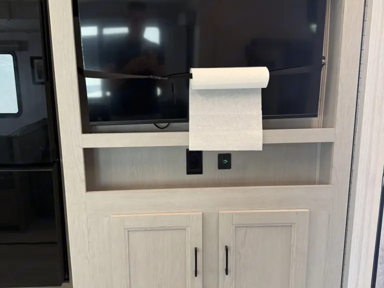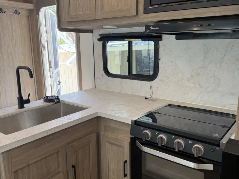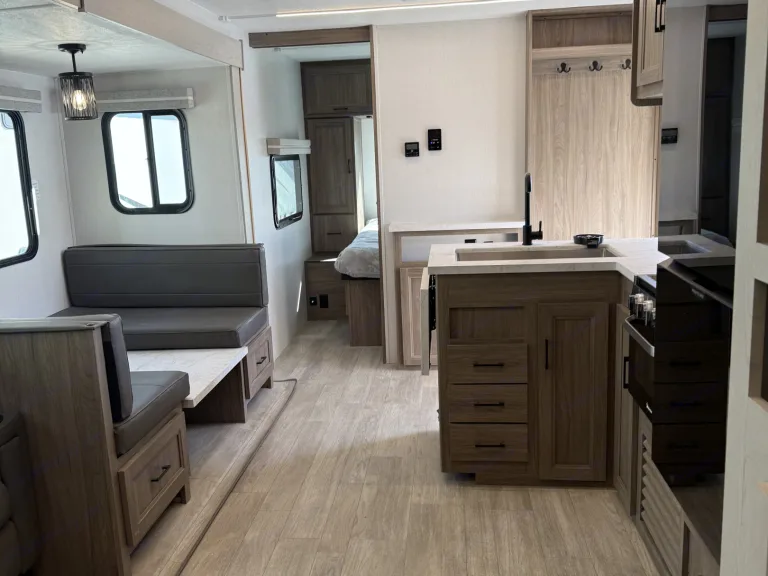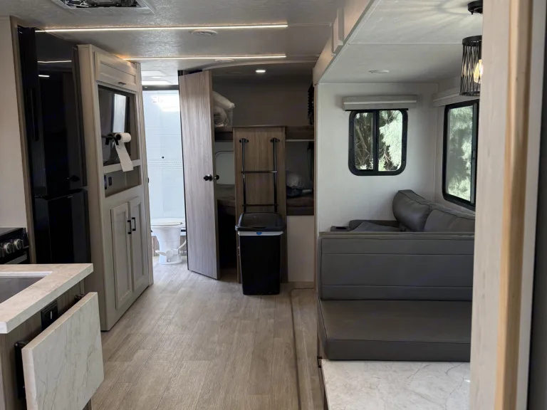 RV rental interior showing a ceiling-mounted AC unit, light wood overhead cabinets, and a window in a modern travel trailer.. Forest River Coachmen Freedom Express 2025