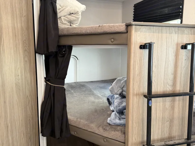 Cozy RV rental bunk beds, complete with privacy curtains, a ladder, and comfortable bedding.. Forest River Coachmen Freedom Express 2025