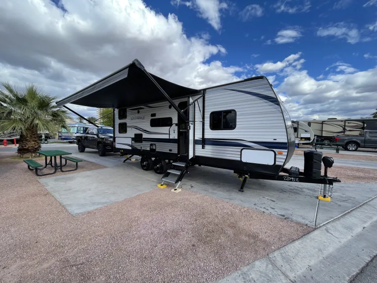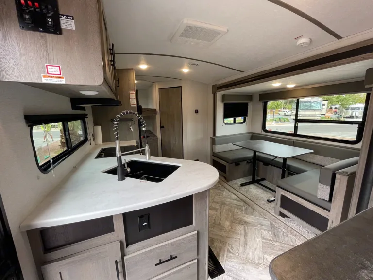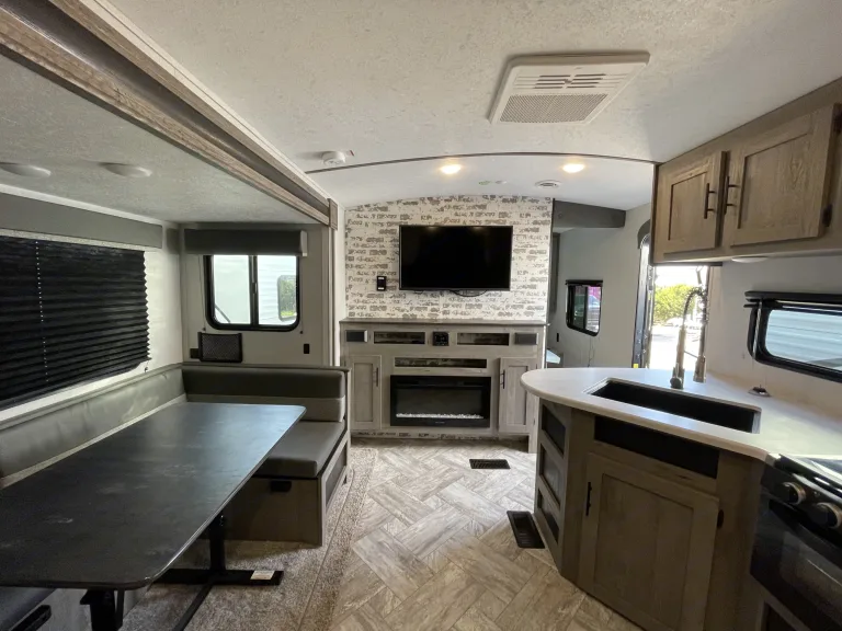 We have only 1 of this model available for delivery only. This is a 2021. It Sleeps 6 comfortably, up to 8 max depending on the size of the occupants. This is a 29 foot trailer with 1 slide out. It has a private master bedroom with a Queen size bed. 2 full size bunk beds in the rear, TV with Hdmi ports, A/C and furnace, electric awning, microwave. The refrigerator operates off of propane or electric. Propane is included, but you will need a generator if you are in a non-hookup site.This trailer holds 60 gallons of fresh water. 2 grey water holding tanks for a total of 78 gallons & 1 black holding tank of 38 gallons. This unit has an outdoor kitchen!Our trailers come with essential kitchen items such as a pot, pan and coffee maker, but they do NOT include: pillows, linens, towels, plates, bowls, cups or utensils. Complete inventory and suggested packing lists are provided with reservation confirmation or can be found in our FAQ section.Please review the 'Enhance Your Trip' section below for delivery locations, generator add-ons, and pet fee.