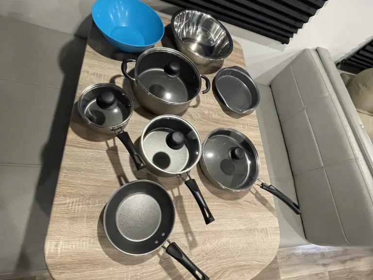 -Fully stocked with pots, pans, utensils, plates, cups, and coffee maker