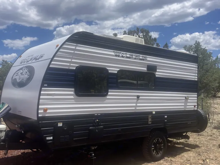 Rate per night. $130Brand new Wolf Pup 14CC with large windows, full kitchen, indoor shower, toilet, awning, propane, solar, and hot/cold water. There is an outside shower which is great for off grid camping. As long as renter is at a campground with full hook ups, there is an air conditioner and a microwave for use.Was ist inbegriffen•Included are cooking and eating utensils, 2 camp chairs, clean bedding, clean towels and washcloth’s , toilet paper, one roll of paper towers, full 26 gallon fresh water tank (with 3 full 6 gallon water jugs as back up), and empty holding tanks.