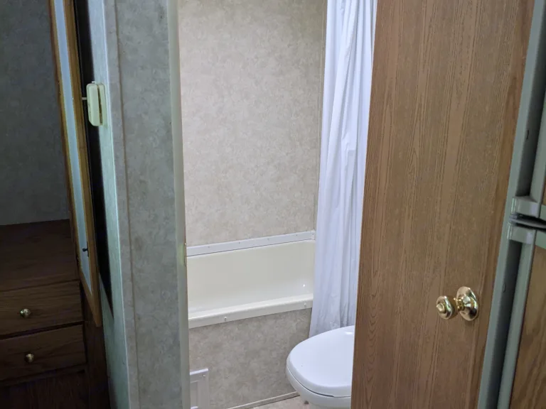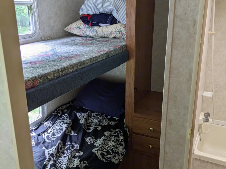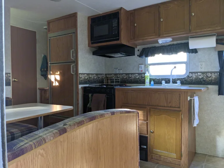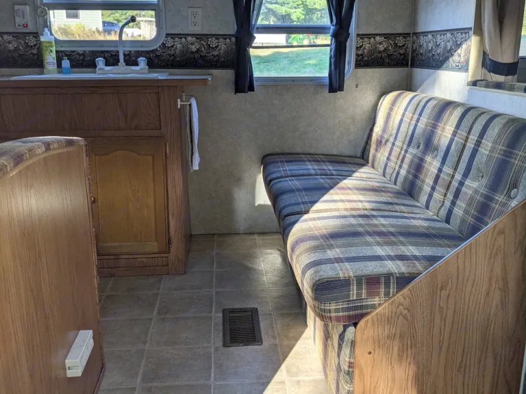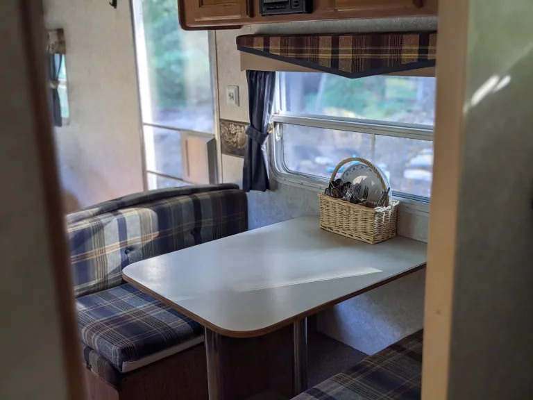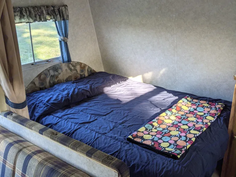 - Queen bed in the front bedroom, twin bunks in the back, fold-out couch, and the dining room table converts to an additional bed.